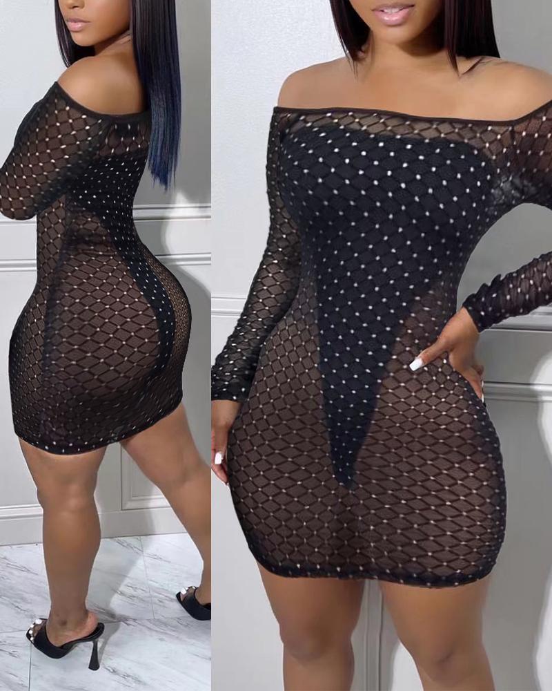 Style:Sexy Type:Suit Set Material:Polyester Neckline:Bandeau,Off the Shoulder Sleeve Style:Long Sleeve Length:Mini Pattern Type:Plain Decoration:Rhinestone,Sheer Mesh Fit Type:Skinny Occasion:Night Out Package Include:1*Dress With Bodysuit