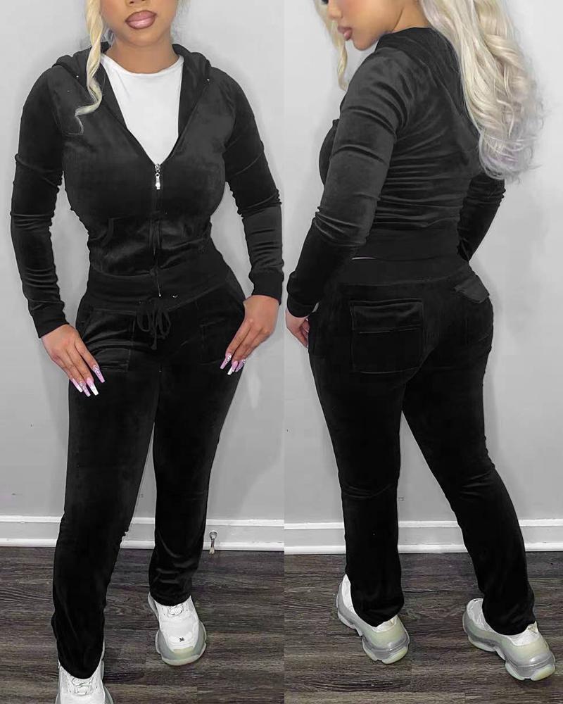 Style:Casual Type:Pants Sets Material:Velvet Neckline:Hooded Sleeve Style:Long Sleeve Length:Long Pattern Type:Plain Decoration:Drawstring,Pocket,Zipper Fit Type:Skinny Occasion:Daily Package Include:1*Pants Set