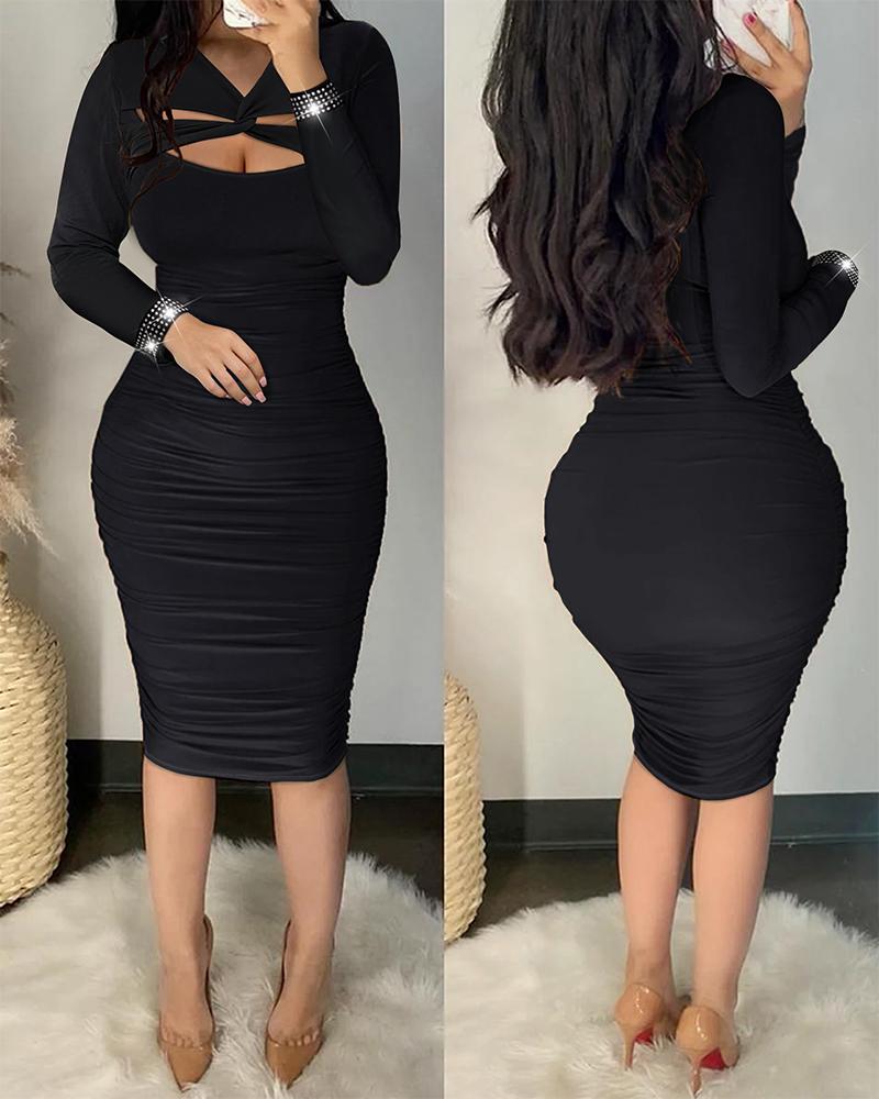 Style:Sexy Type:Bodycon Material:Polyester Neckline:V-Neck Sleeve Style:Long Sleeve Length:Midi Pattern Type:Plain Decoration:Cutout,Rhinestone,Ruched,Twist Fit Type:Skinny Occasion:Party Package Include:1* Dress