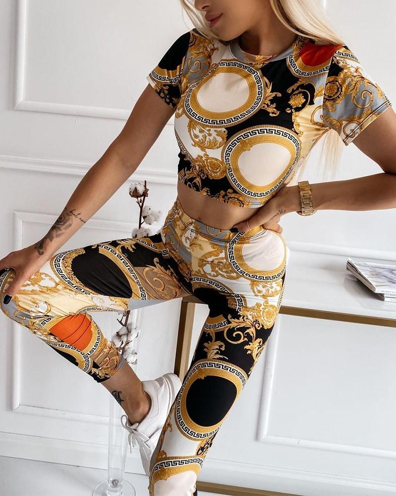 Style:Casual,Vintage Type:Pants Sets Material:Polyester Neckline:O-neck Sleeve Style:Short Sleeve Length:Long Pattern Type:Scarf,Baroque Fit Type:Regular Occasion:Daily Package Include:1*Pants Set