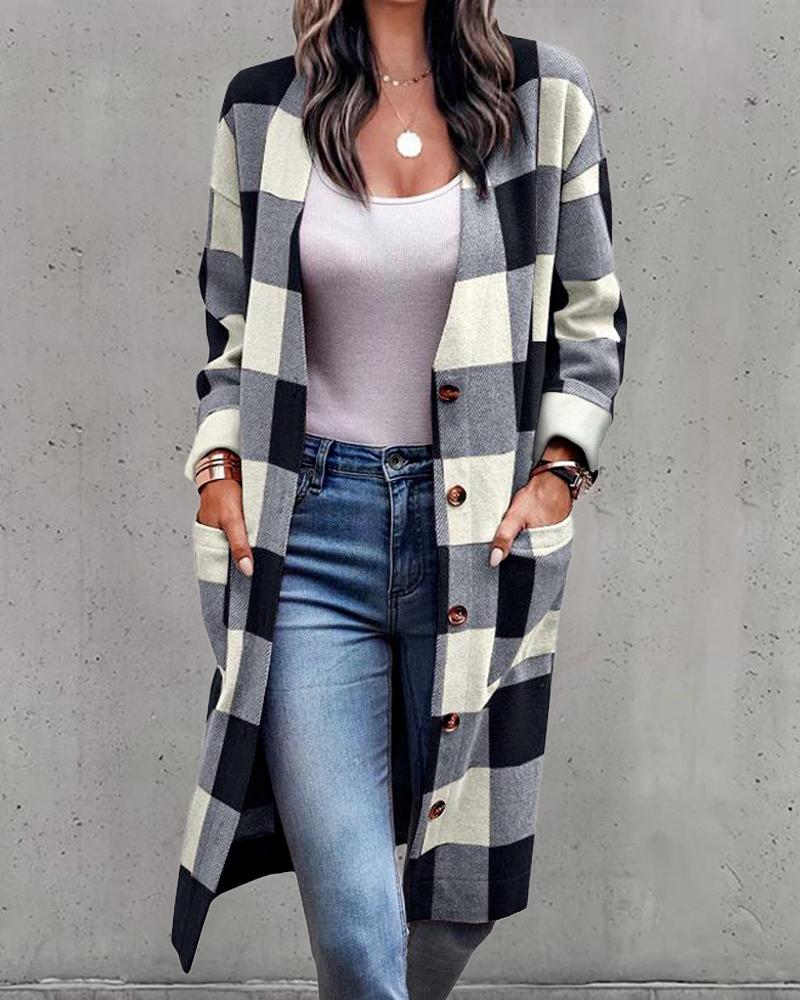 Style:Casual Type:Coat Material:Polyester Neckline:Open Front Sleeve Style:Long Sleeve Length:Long Pattern Type:Plaid Decoration:Button,Pocket Fit Type:Regular Occasion:Daily Package Include:1*Coat