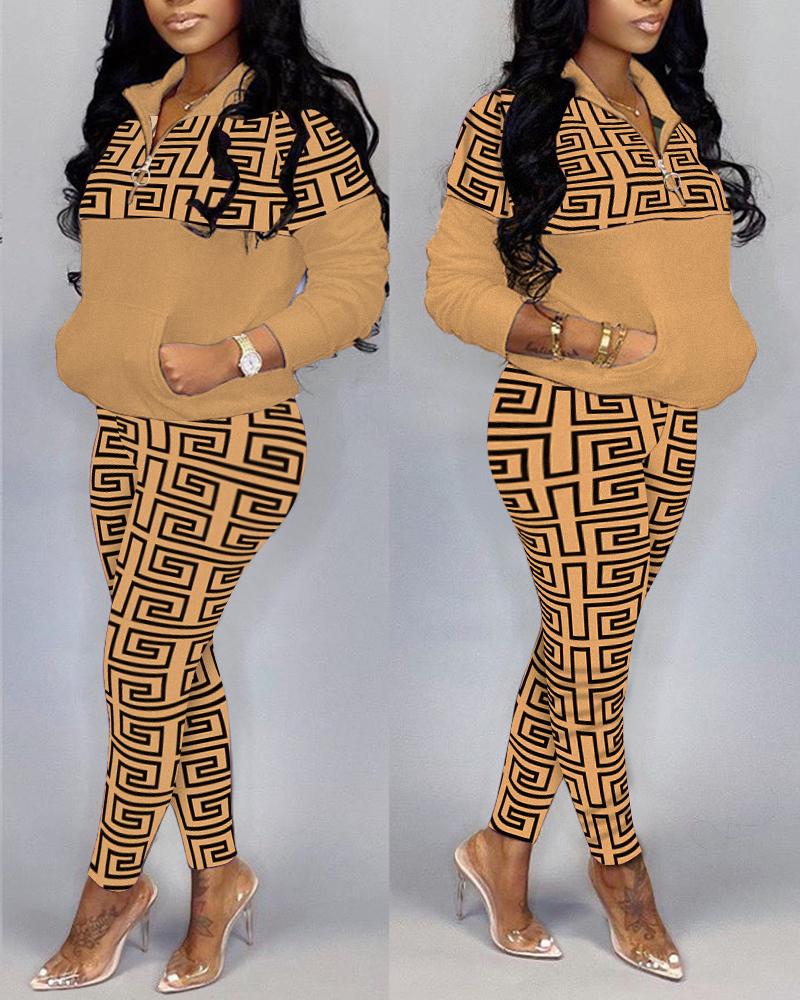 Style:Casual Type:Pants Sets Material:95%Polyester,5%Elastane Neckline:Turn-down Collar Sleeve Style:Long Sleeve Length:Long Pattern Type:Geometric Decoration:Pocket,Zipper Fit Type:Regular Occasion:Daily Package Include:Pants Set