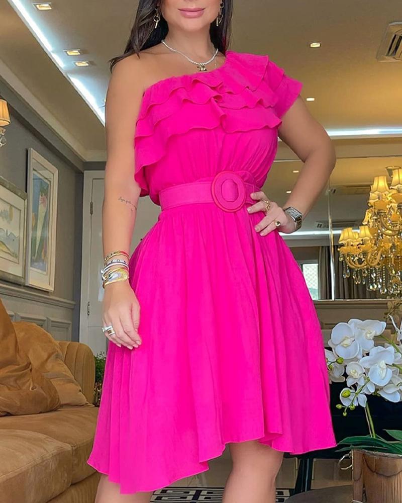 One Shoulder Ruffle Hem Belted Casual Dress
