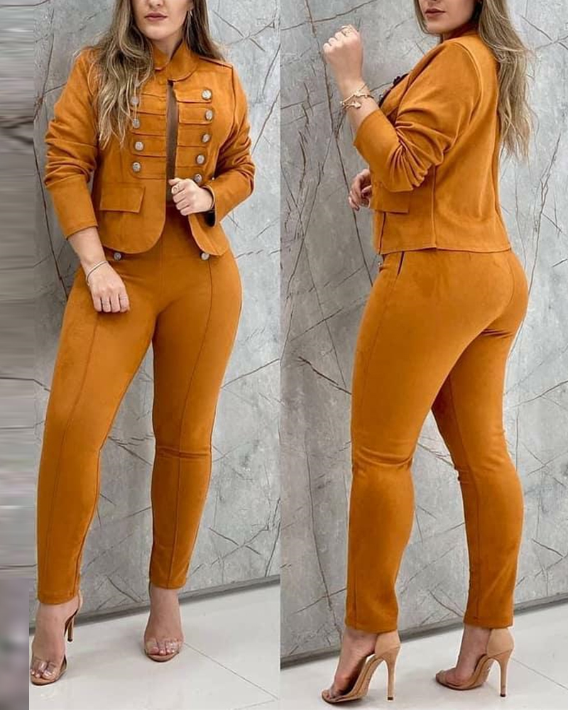 Style:Chic,Elegant Type:Blazer Sets Material:95%Polyester,5%Elastane Neckline:Stand Collar Sleeve Style:Long Sleeve Length:Long Pattern Type:Plain Decoration:Button Fit Type:Regular Occasion:Work Package Include:1*Blazer Set