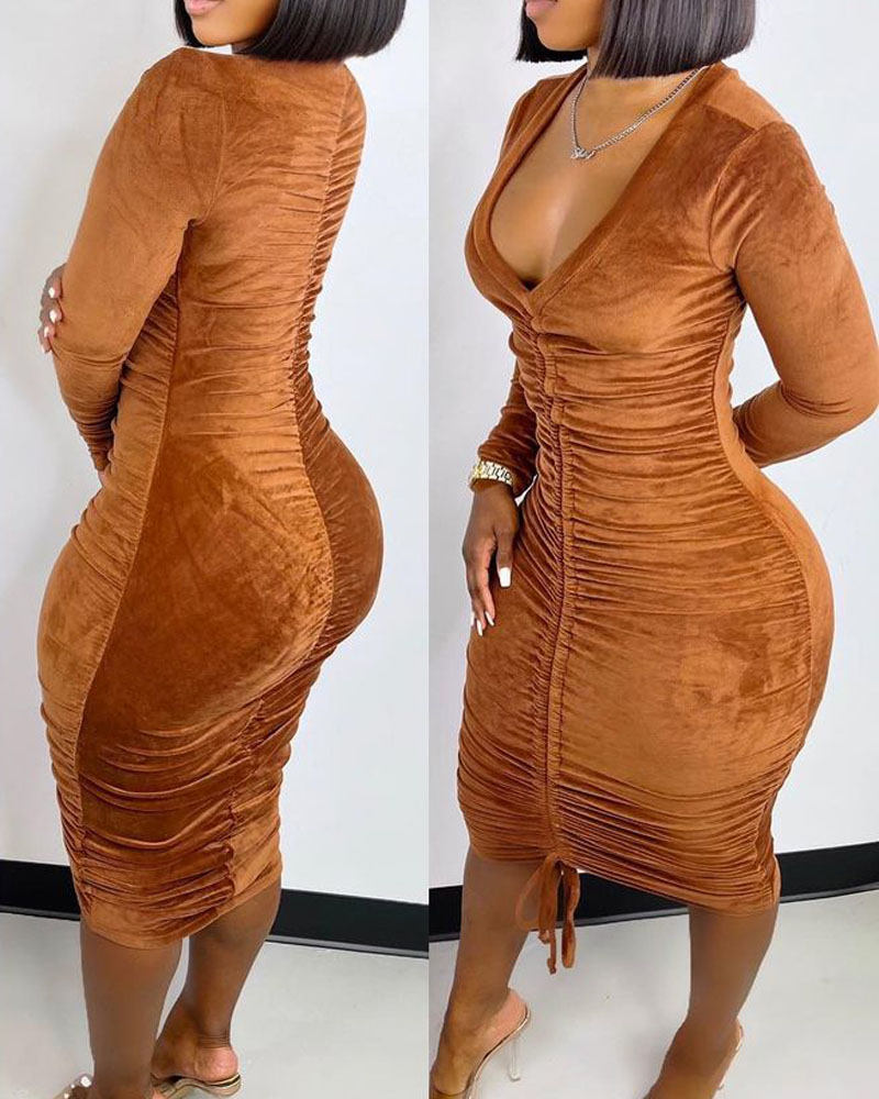 Style:Chic,Sexy Type:Bodycon Material:Velvet Neckline:Plunge Sleeve Style:Long Sleeve Length:Maxi Pattern Type:Plain Decoration:Drawstring,Ruched Fit Type:Skinny Occasion:Daily Package Include:1* Dress