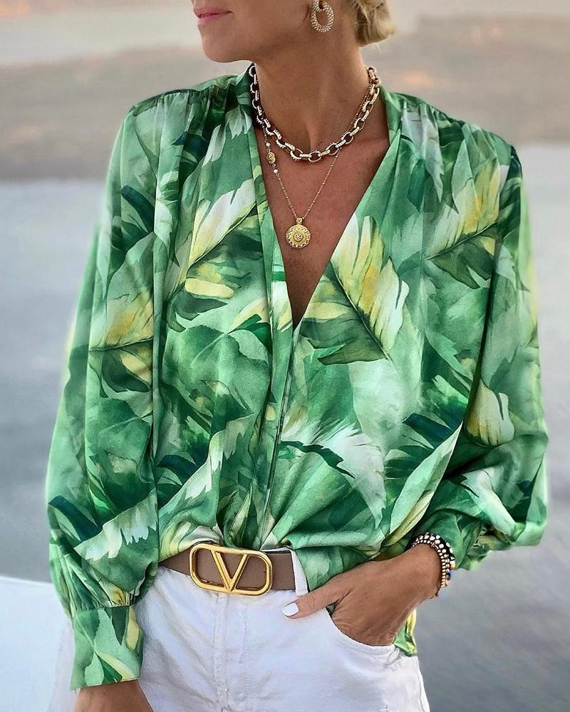Style:Casual,Chic Type:Blouses Material:Polyester Neckline:Plunge Sleeve Style:Lantern Sleeve,Long Sleeve Length:Regular Pattern Type:Random Print,Tropical Decoration:Lantern Sleeve Fit Type:Regular Occasion:Daily,Vacation Package Include:1* Blouse