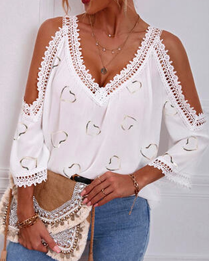 Style:Casual Type:Blouses Material:Polyester Neckline:Cold Shoulder Sleeve Style:Three Quarters Length:Regular Pattern Type:Heart Decoration:Contrast Lace Fit Type:Regular Occasion:Daily Package Include:1* Blouse