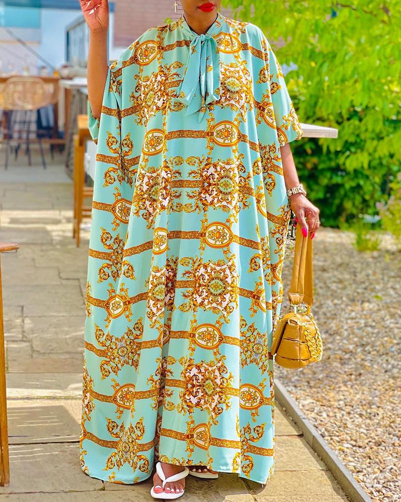Style:Chic Type:Straight Material:Polyester Neckline:Tie Neck Sleeve Style:Half Sleeve Length:Maxi Pattern Type:Baroque Decoration:Tied Detail Fit Type:Oversized Occasion:Beach,Vacation Package Include:1* Dress