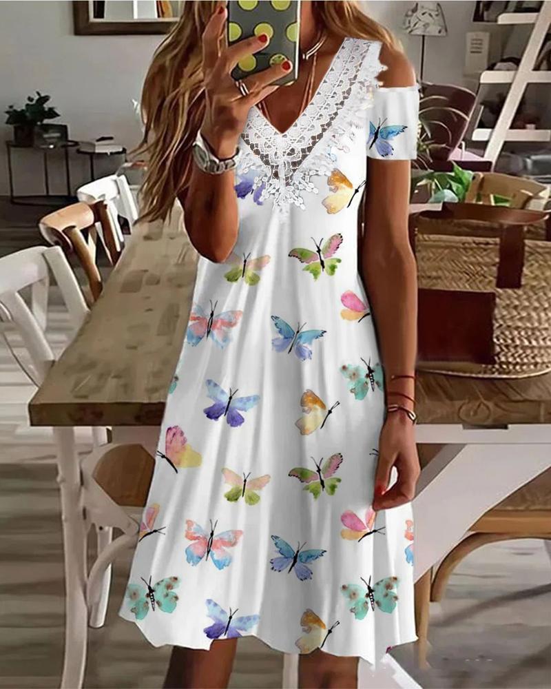 Style:Casual Type:A Line Material:95%Polyester,5%Elastane Neckline:Cold Shoulder,V-Neck Sleeve Style:Short Sleeve Length:Mini Pattern Type:Butterfly Decoration:Contrast Lace Fit Type:Regular Occasion:Daily,Vacation Package Include:1* Dress