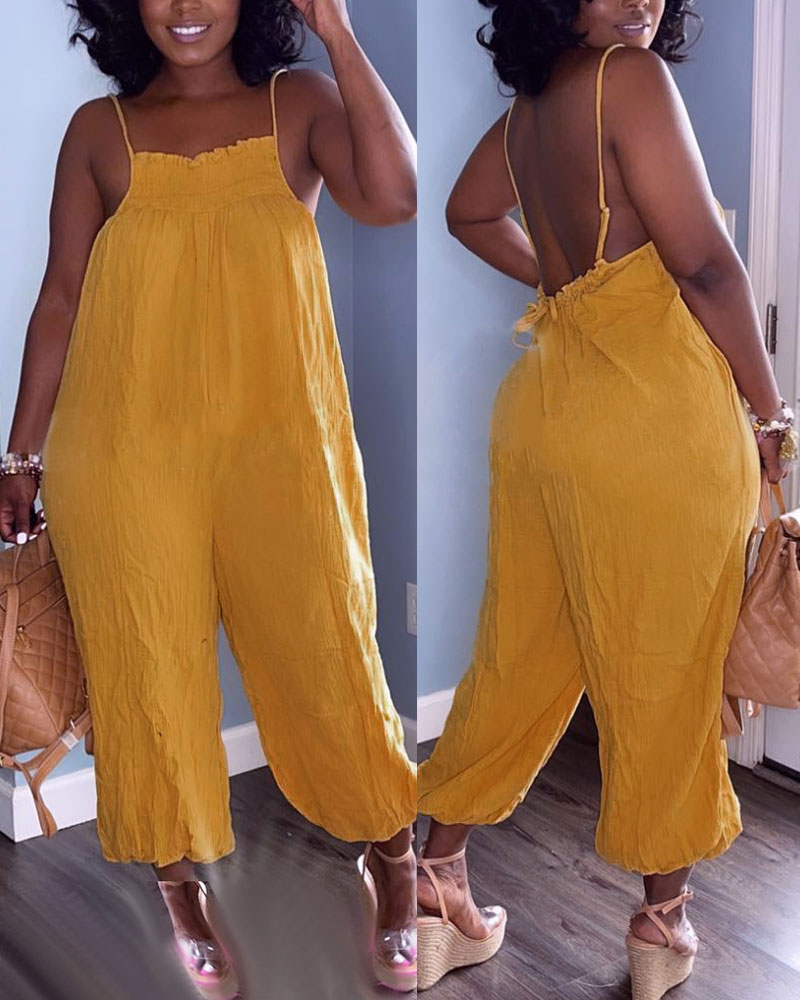 Style:Casual Type:Jumpsuit Material:Polyester Neckline:Square Neck Sleeve Style:Spaghetti Strap Length:Long Pattern Type:Plain Decoration:Backless,Frill Hem,Shirred,Tied Detail Fit Type:Oversized Occasion:Daily Package Include:1*Jumpsuit