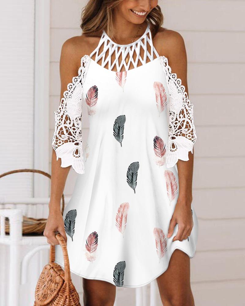 Feather Print Cold Shoulder Contrast Lace Casual Dress