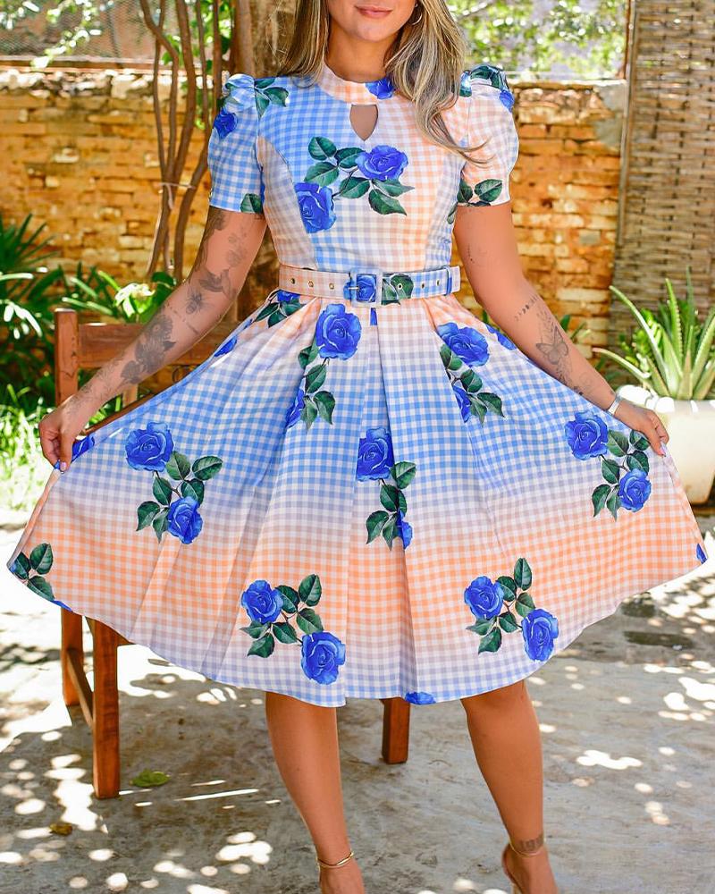 Style:Casual,Sweet Type:A Line Material:97%Polyester,3%Elastane Neckline:Keyhole Neck Sleeve Style:Puff Sleeve,Short Sleeve Length:Midi Pattern Type:Floral,Plaid Decoration:Pocket Fit Type:Regular With Belt:Yes Occasion:Daily,Vacation Package Include:1*Dress (With Belt) Fabric Elasticity:Slight Stretch