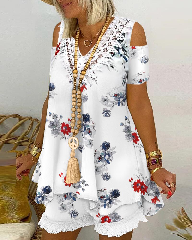 Style:Casual Type:Shorts Set Material:97%Polyester,3%Elastane Neckline:Cold Shoulder Sleeve Style:Short Sleeve Length:Above Knee Pattern Type:Floral Decoration:Contrast Lace,Tassel Fit Type:Regular Occasion:Daily,Vacation Package Include:1*Shorts Set Fabric Elasticity:Slight Stretch