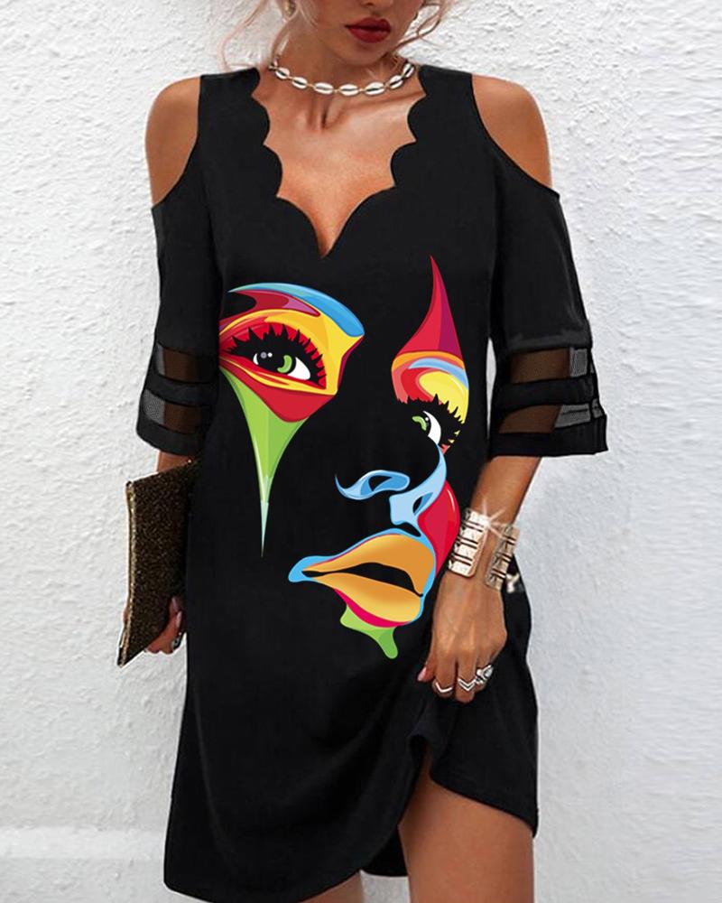 Style:Casual,Chic Type:A Line Material:95%Polyester,5%Elastane Neckline:Cold Shoulder Sleeve Style:Three Quarters Length:Mini Pattern Type:Figure Decoration:Sheer Mesh Fit Type:Regular Occasion:Daily Package Include:1* Dress