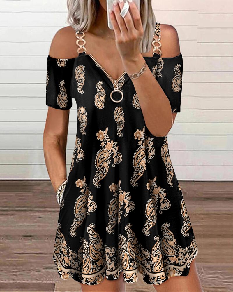 Style:Casual Type:A Line Material:95%Polyester,5%Elastane Neckline:Cold Shoulder Sleeve Style:Short Sleeve Length:Mini Pattern Type:Paisley Decoration:Chain,Pocket,Zipper Fit Type:Regular Occasion:Daily,Vacation Package Include:1* Dress