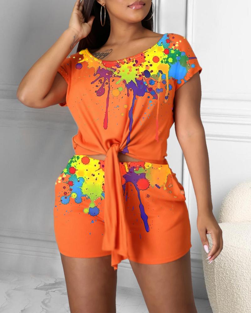 Ink Splash Tied Detail Casual Top & Shorts Set