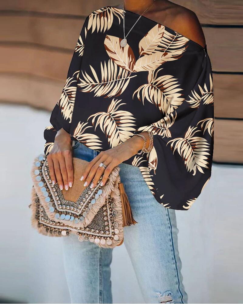 Style:Casual Type:Blouses Material:97%Polyester,3%Elastane Neckline:Skew Neck Sleeve Style:Lantern Sleeve,Long Sleeve Length:Regular Pattern Type:Tropical Decoration:Lantern Sleeve Fit Type:Regular Occasion:Daily,Vacation Package Include:1* Blouse Fabric Elasticity:Slight Stretch