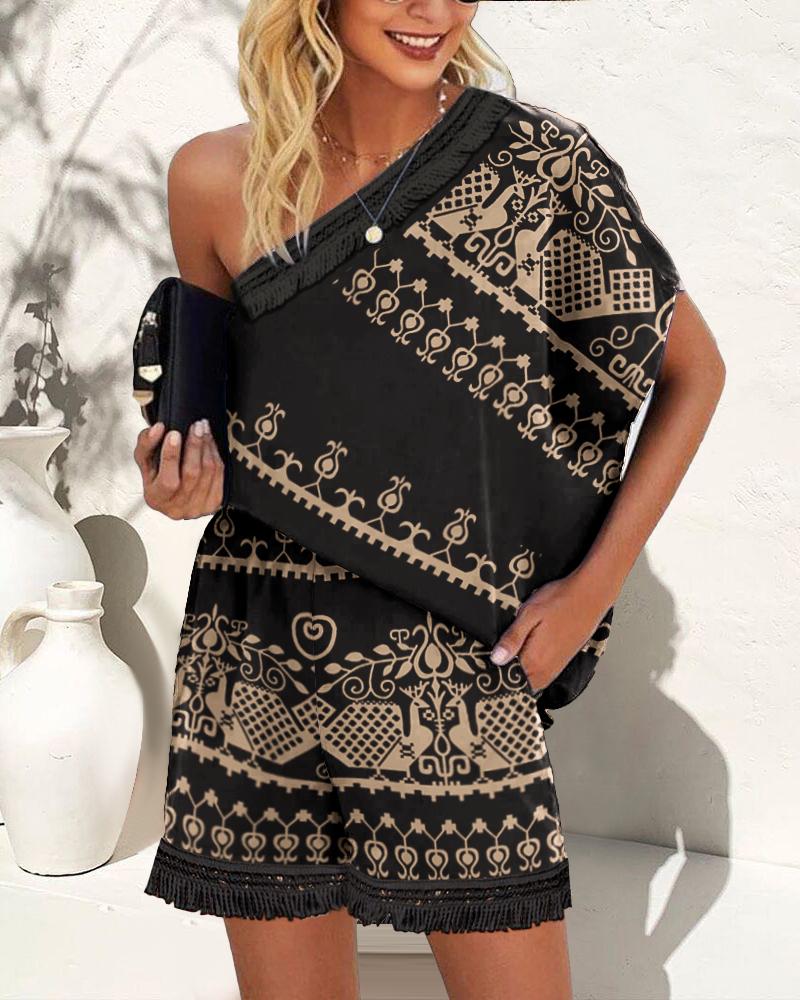 Tribal Print Tassel Trim One Shoulder Top & Shorts Set