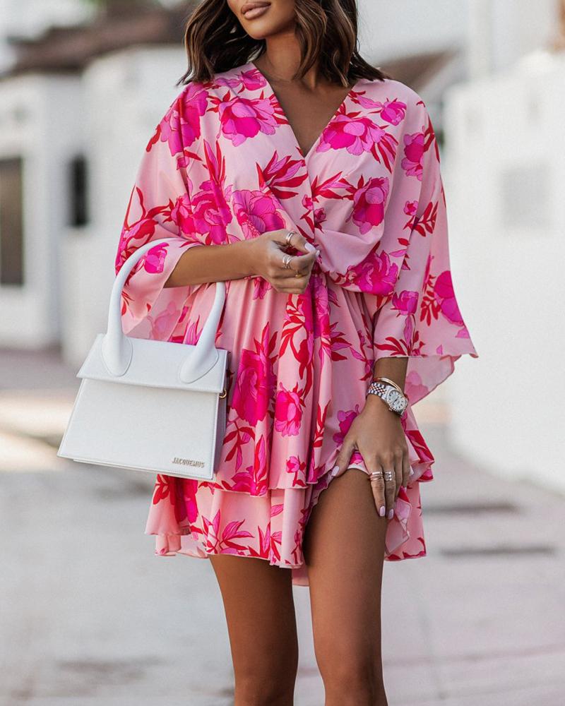 Style:Casual,Chic Type:Layered/Tiered Material:Polyester Neckline:V-Neck Sleeve Style:Batwing Sleeve,Half Sleeve Length:Mini Pattern Type:Floral,Plants Decoration:Batwing Sleeve,Twist Fit Type:Regular Occasion:Daily,Vacation Package Include:1* Dress