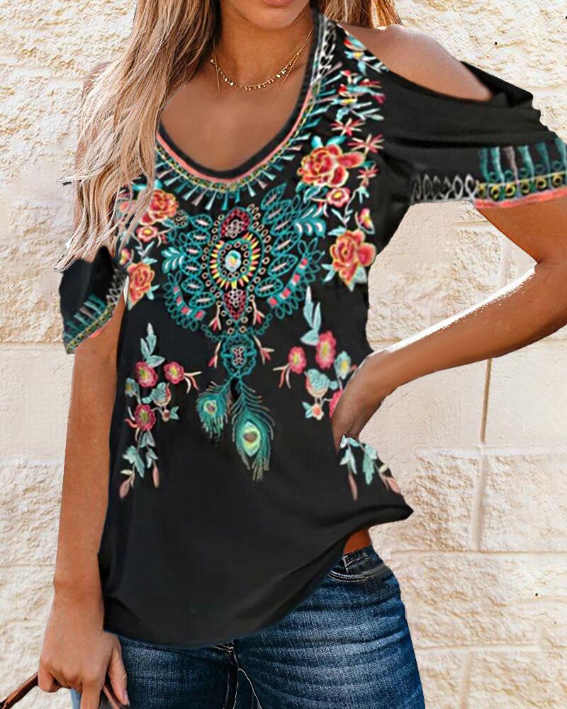 Style:Boho,Vintage Type:Tee Material:Polyester Neckline:Cold Shoulder Sleeve Style:Short Sleeve Length:Regular Pattern Type:Floral,Tribal Fit Type:Regular Occasion:Daily Package Include:1*T-Shirt