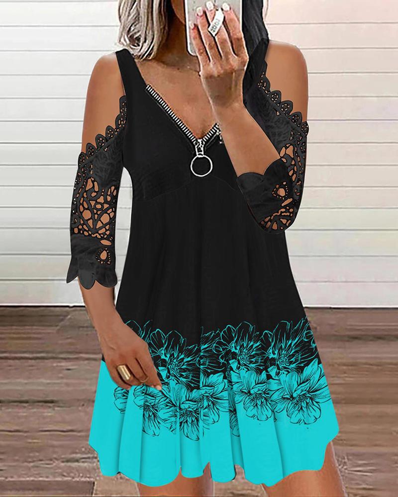 Style:Casual,Chic Type:A Line Material:Polyester Neckline:Cold Shoulder Sleeve Style:Three Quarters Length:Mini Pattern Type:Colorblock,Floral Decoration:Contrast Lace,Zipper Fit Type:Regular Occasion:Daily Package Include:1* Dress