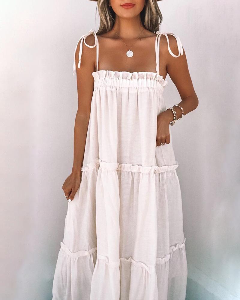 Style:Casual,Chic Type:Straight Material:100%Polyester Neckline:Square Neck Sleeve Style:Spaghetti Strap Length:Maxi Pattern Type:Plain Decoration:Frill Hem,Tied Detail Fit Type:Regular Occasion:Daily Package Include:1* Dress