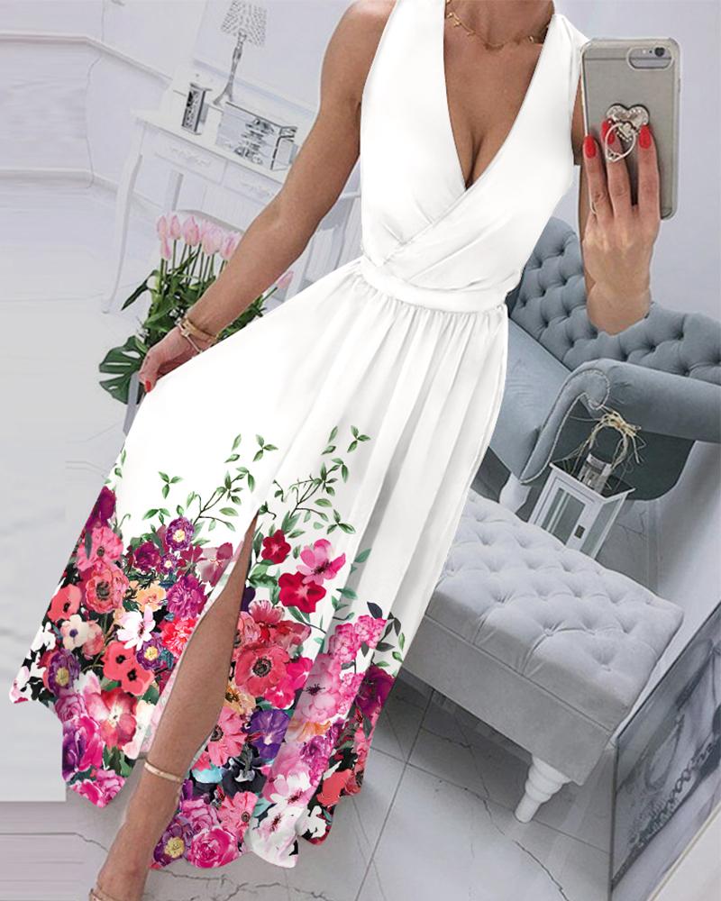 Style:Chic Type:Slit,Wrap Material:Polyester Neckline:V-Neck Sleeve Style:Sleeveless Length:Maxi Pattern Type:Floral Decoration:Slit,Zipper Fit Type:Regular Occasion:Daily,Vacation Package Include:1* Dress