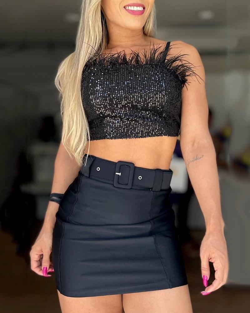 Feather Decor Sequin Cami Top & Skirt Set With Belt