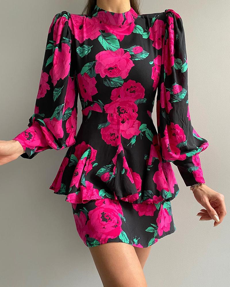 Style:Chic Type:Layered/Tiered Material:Polyester Neckline:Mock Neck Sleeve Style:Lantern Sleeve,Long Sleeve Length:Mini Pattern Type:Floral,Random Print Decoration:Lantern Sleeve,Ruched Fit Type:Regular Occasion:Daily Package Include:1* Dress