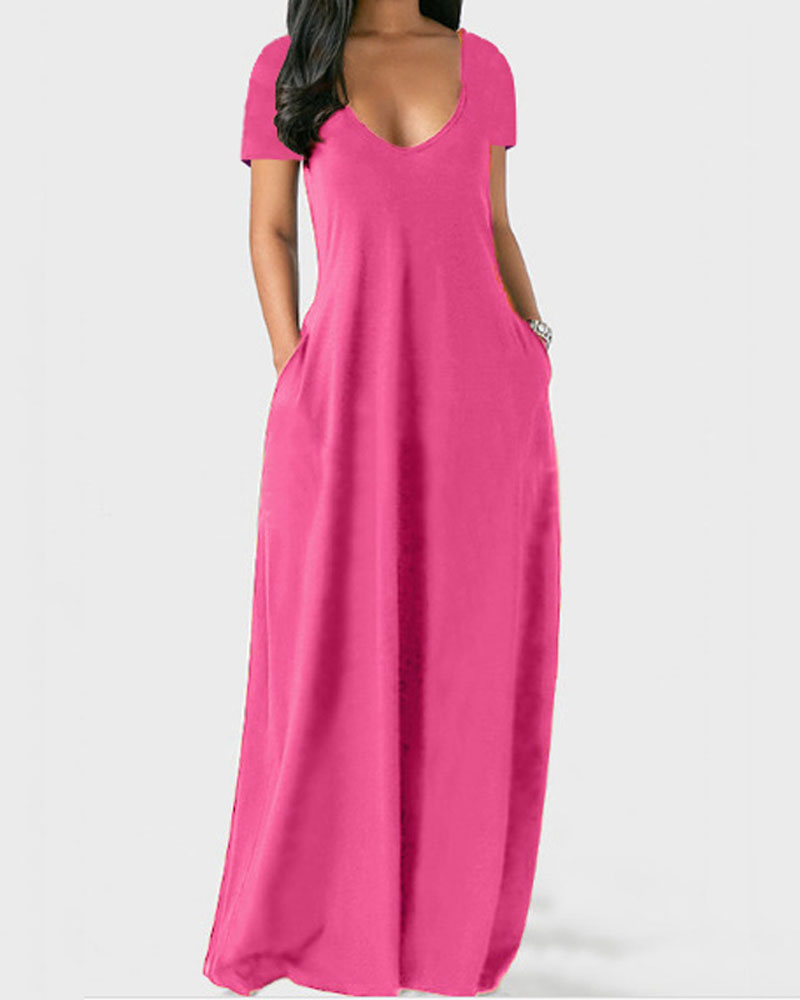 Style:Basics,Casual Type:Straight,Tee Material:Polyester Neckline:V-Neck Sleeve Style:Short Sleeve Length:Maxi Pattern Type:Plain Decoration:Pocket Fit Type:Oversized Occasion:Daily Package Include:1* Dress