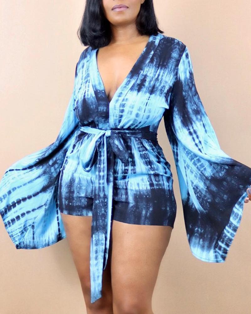 Tie Dye Print Bell Sleeve Romper With Belt
