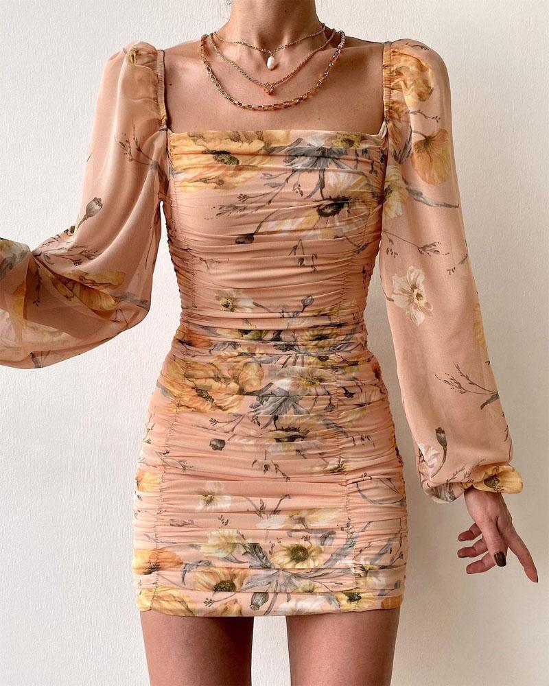 Style:Chic,Sexy Type:Bodycon Material:Polyester Neckline:Square Neck Sleeve Style:Lantern Sleeve,Long Sleeve Length:Mini Pattern Type:Floral Decoration:Lantern Sleeve,Ruched Fit Type:Skinny Occasion:Daily Package Include:1* Dress