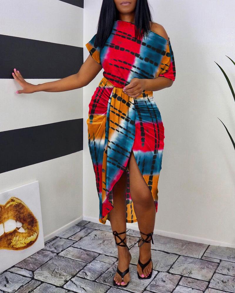 Style:Casual,Chic Type:Slit Material:Polyester Neckline:Skew Neck Sleeve Style:Short Sleeve Length:Midi Pattern Type:Tie Dye,Ombre Decoration:Ruched,Slit Fit Type:Regular Occasion:Daily Package Include:1* Dress