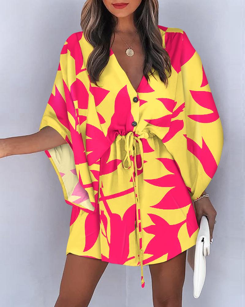 Style:Casual,Chic Type:A Line Material:97%Polyester,3%Elastane Neckline:V-Neck Sleeve Style:Batwing Sleeve,Three Quarters Length:Mini Pattern Type:Plants Decoration:Batwing Sleeve,Button,Drawstring Fit Type:Oversized Occasion:Daily,Vacation Package Include:1* Dress Fabric Elasticity:Slight Stretch