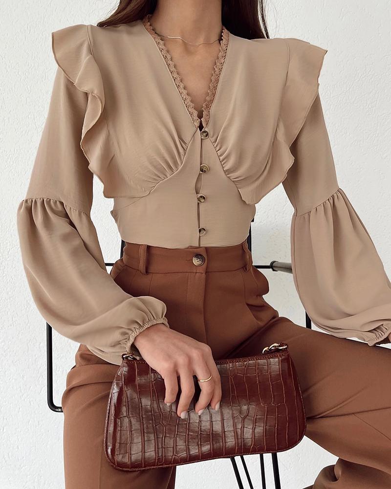 Style:Chic Type:Blouses Material:100%Polyester Neckline:V-Neck Sleeve Style:Lantern Sleeve,Long Sleeve Length:Regular Pattern Type:Plain Decoration:Button,Contrast Lace,Lantern Sleeve,Ruffles Fit Type:Regular Occasion:Daily Package Include:1* Blouse