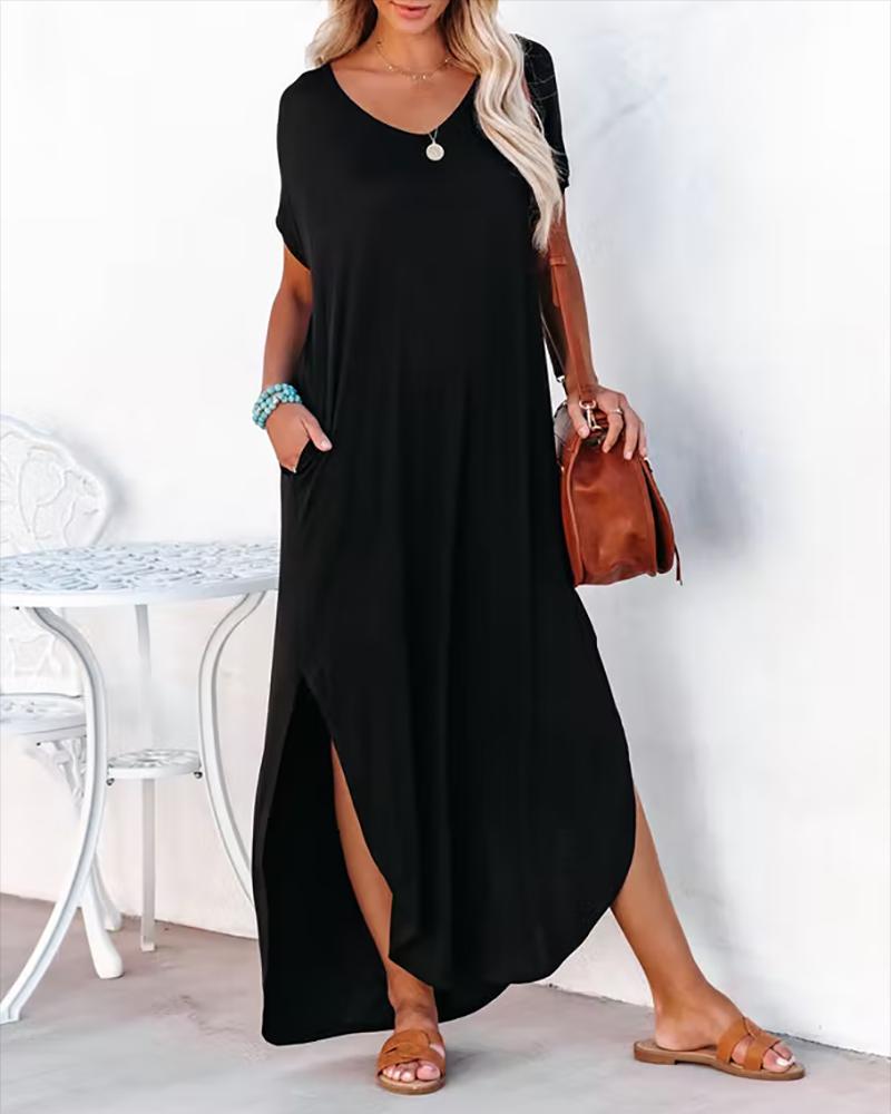 Style:Basics,Casual Type:Slit,Straight Material:Polyester Neckline:V-Neck Sleeve Style:Short Sleeve Length:Maxi Pattern Type:Plain Decoration:Pocket,Slit Fit Type:Regular Occasion:Daily,Vacation Package Include:1* Dress