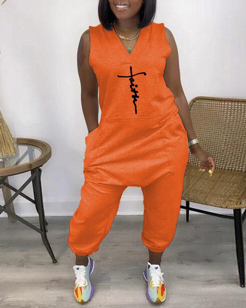 Faith Print Pocket Design Sleeveless Jumpsuit