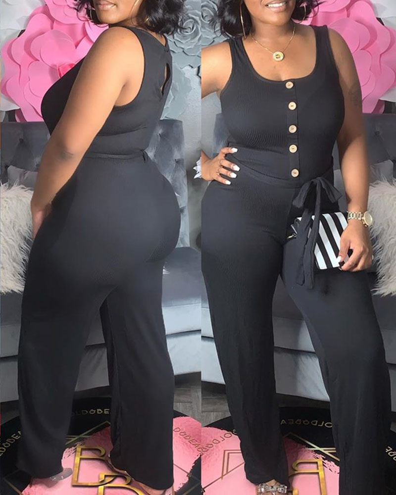 Style:Chic Type:Wide Leg,Jumpsuits Material:Polyester Neckline:U-Neck Sleeve Style:Sleeveless Length:Long Pattern Type:Plain Decoration:Button Fit Type:Regular With Belt:Yes Occasion:Daily Package Include:1*Jumpsuit(With Belt)