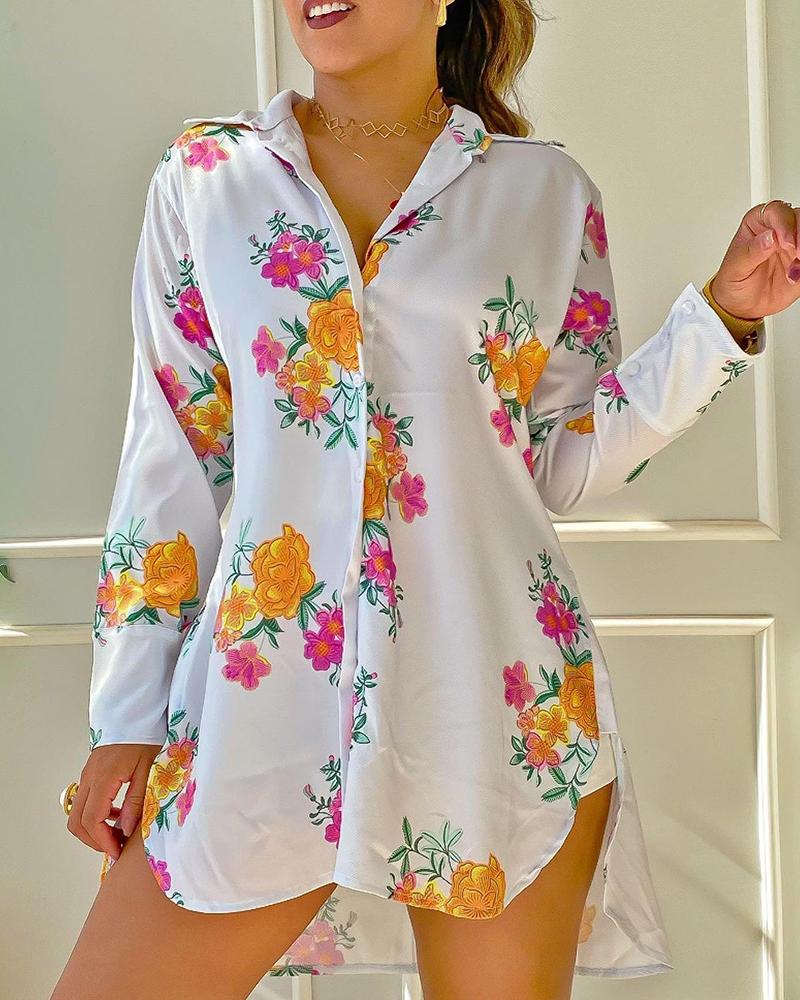 Asymmetrical Floral Print Buttoned Shirt Dress