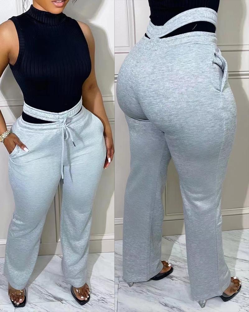 Style:Casual,Chic Type:Pants,Sweatpants Material:Polyester Length:Long Pattern Type:Plain Decoration:Cutout,Drawstring,Pocket Fit Type:Regular Occasion:Daily Package Include:1*Pants (without top)