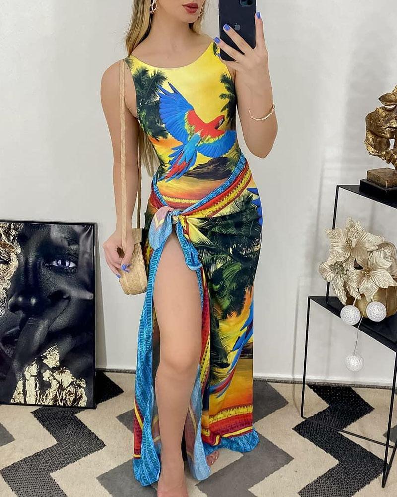 Animal Tropical Print Backless One Piece Swimsuit With Cover Up