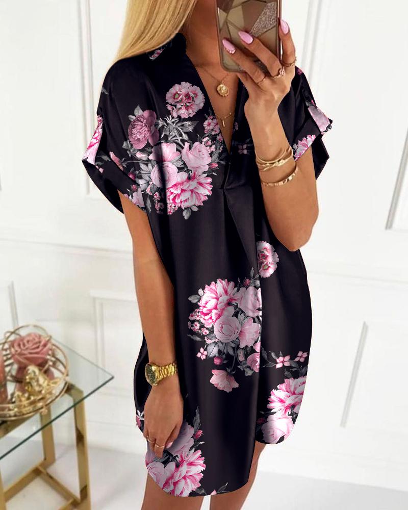 Style:Casual,Chic Type:Straight Material:97%Polyester,3%Elastane Neckline:V-Neck,Turn-down Collar Sleeve Style:Short Sleeve Length:Mini Pattern Type:Floral Fit Type:Oversized Occasion:Daily,Vacation Package Include:1* Dress Fabric Elasticity:Slight Stretch