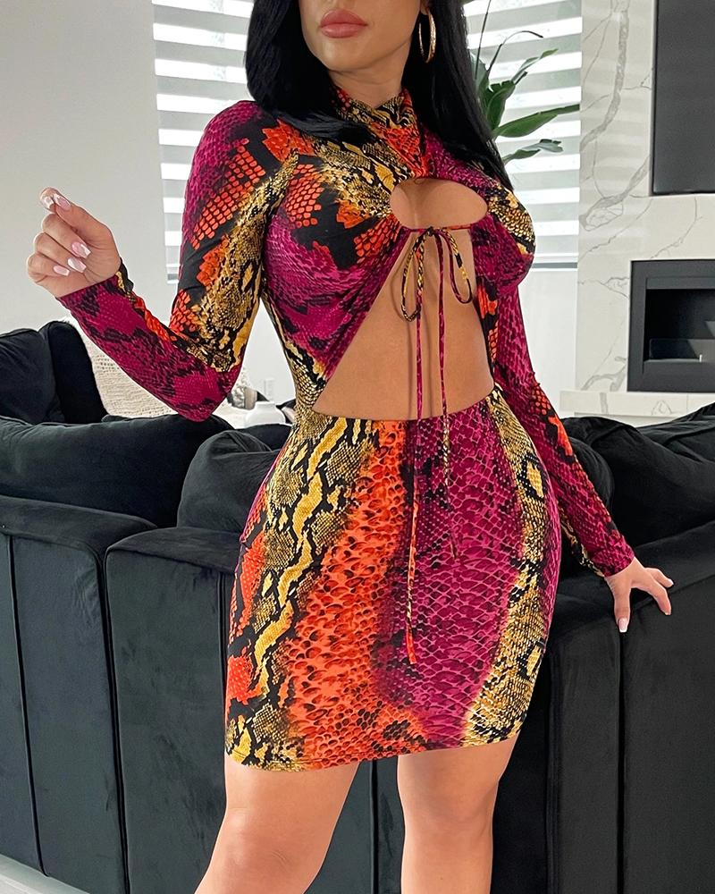 Snakeskin Print Long Sleeve Cutout Bodyocn Dress