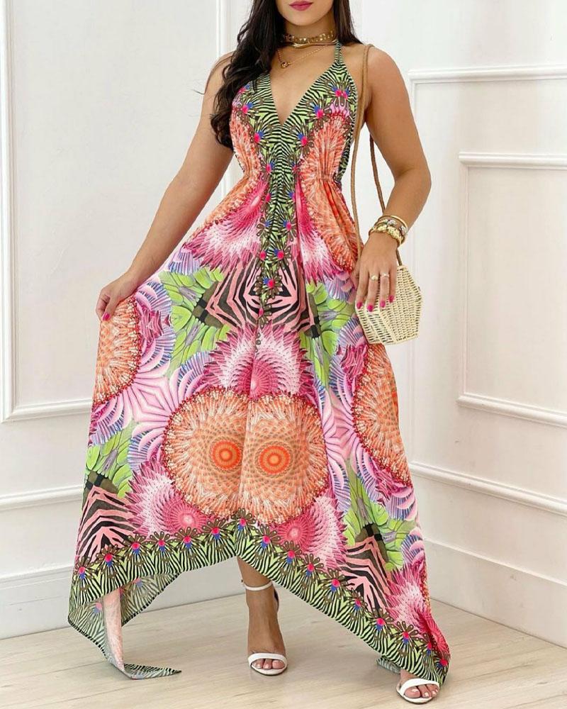 Style:Casual,Vintage Type:Asymmetrical Material:Polyester Neckline:Halter Sleeve Style:Sleeveless Length:Asymmetrical Pattern Type:All Over Print,Tribal Decoration:Backless,Tied Detail Fit Type:Regular Occasion:Daily,Vacation Package Include:1* Dress