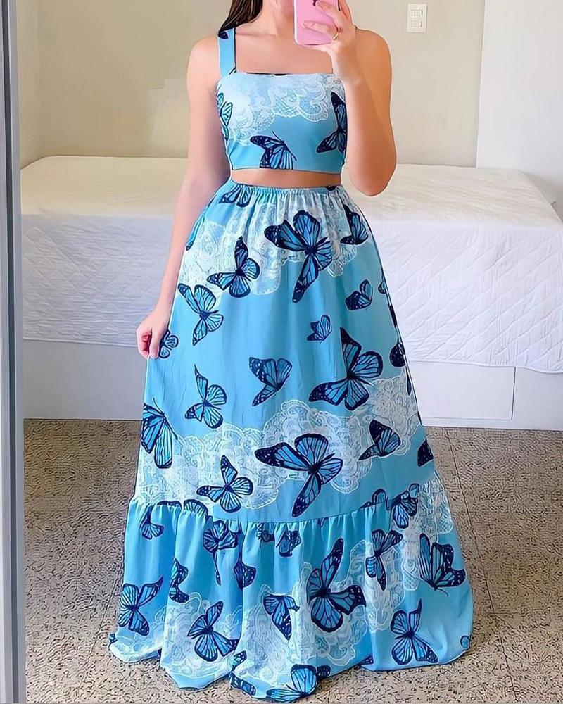 Style:Casual,Chic Type:Skirt Sets Material:Polyester Neckline:Square Neck Sleeve Style:Thick Strap Length:Maxi Pattern Type:Butterfly Fit Type:Regular Occasion:Daily,Vacation Package Include:Skirt Set