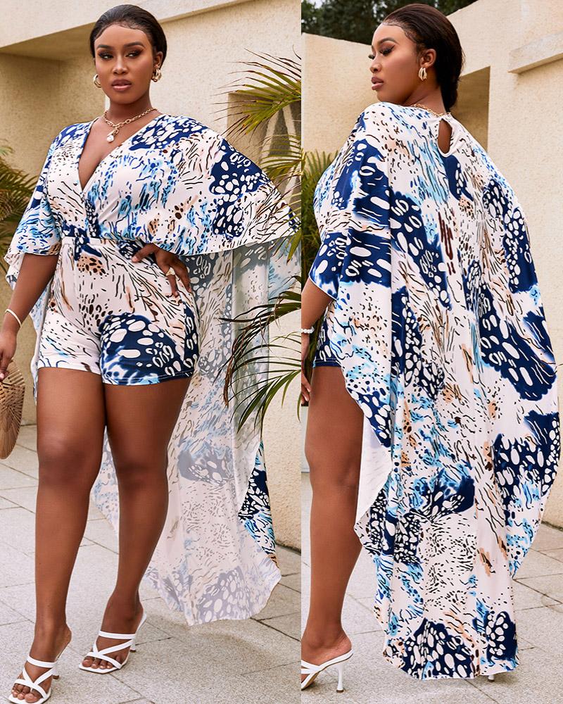Plunge Cheetah Abstract Print Batwing Cloak Sleeve Romper