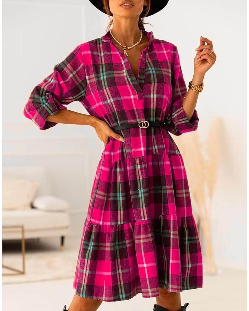 Style:Casual Type:Shirt Material:97%Polyester,3%Elastane Neckline:V-Neck Sleeve Style:Roll Up Sleeve,Long Sleeve Length:Midi Pattern Type:Plaid Fit Type:Regular Occasion:Daily Package Include:1* Dress