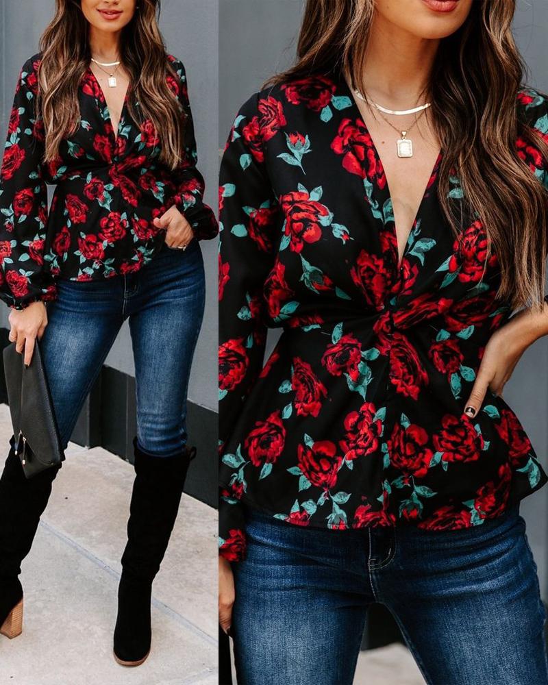 Style:Casual,Chic Type:Blouses Material:Polyester Neckline:V-Neck Sleeve Style:Long Sleeve Length:Regular Pattern Type:Floral Fit Type:Regular Occasion:Daily Package Include:1* Blouse