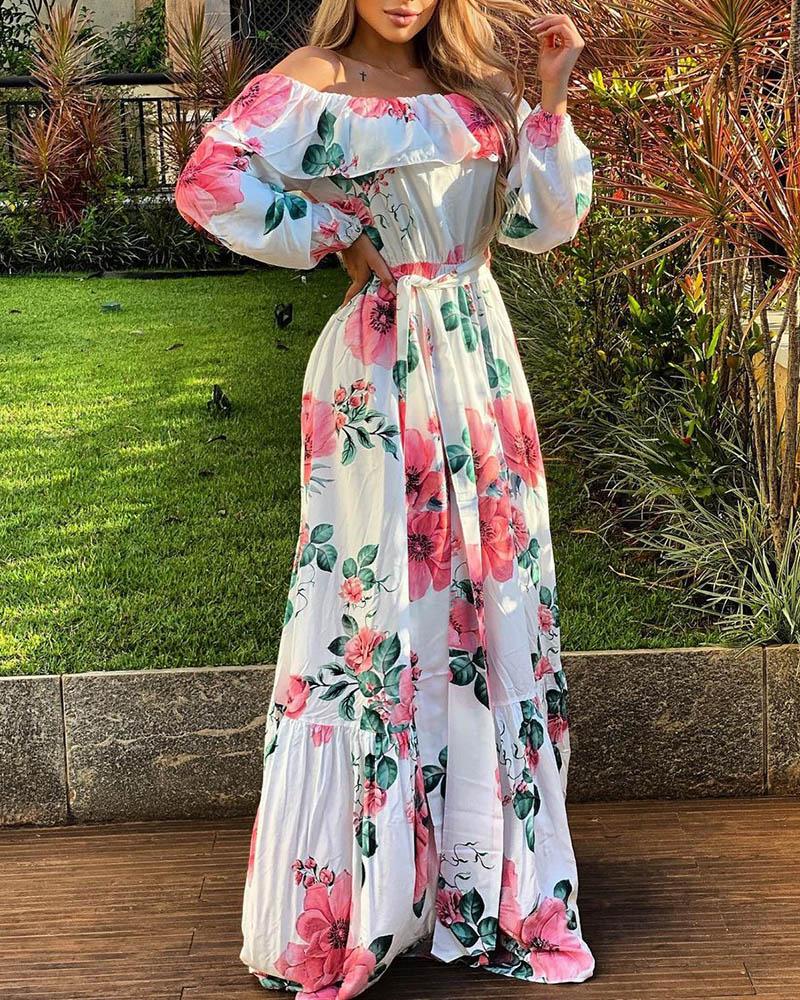 Style:Casual,Chic Type:A Line Material:Polyester Neckline:Off the Shoulder Sleeve Style:Long Sleeve Length:Maxi Pattern Type:Floral Decoration:Ruffles Fit Type:Oversized Occasion:Daily,Vacation Package Include:1* Dress