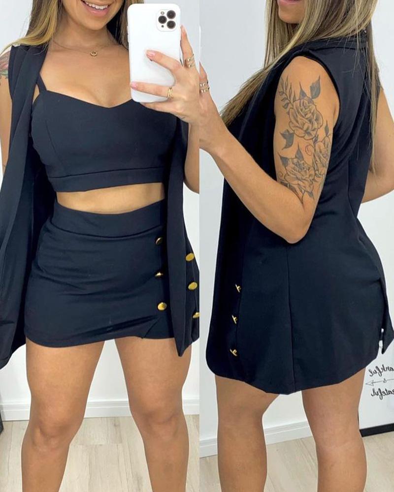 Style:Chic Type:Suit Set Material:95%Polyester,5%Elastane Neckline:V-Neck Sleeve Style:Sleeveless Length:Mini Pattern Type:Plain Decoration:Button Fit Type:Skinny Occasion:Daily Package Include:2PCS(With Coat)